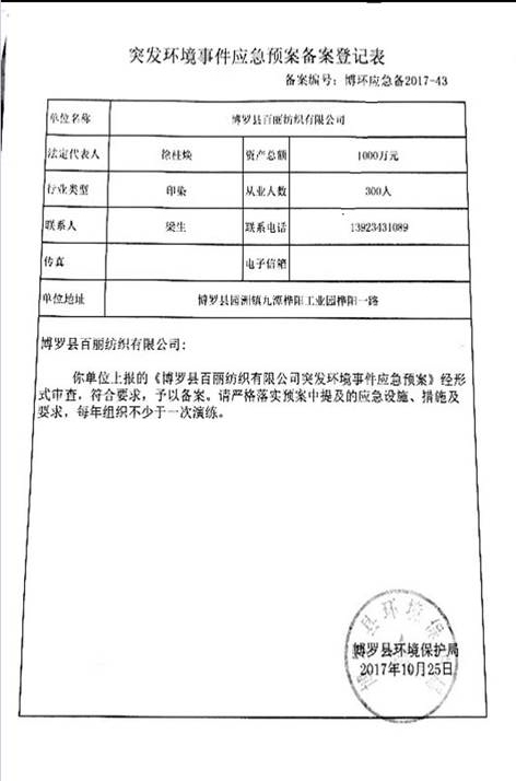 已制訂《博羅縣百麗紡織有限公司突發(fā)環(huán)境事件應(yīng)急預(yù)案》,并于2017年 10月25日在博羅縣環(huán)境保護局備案,