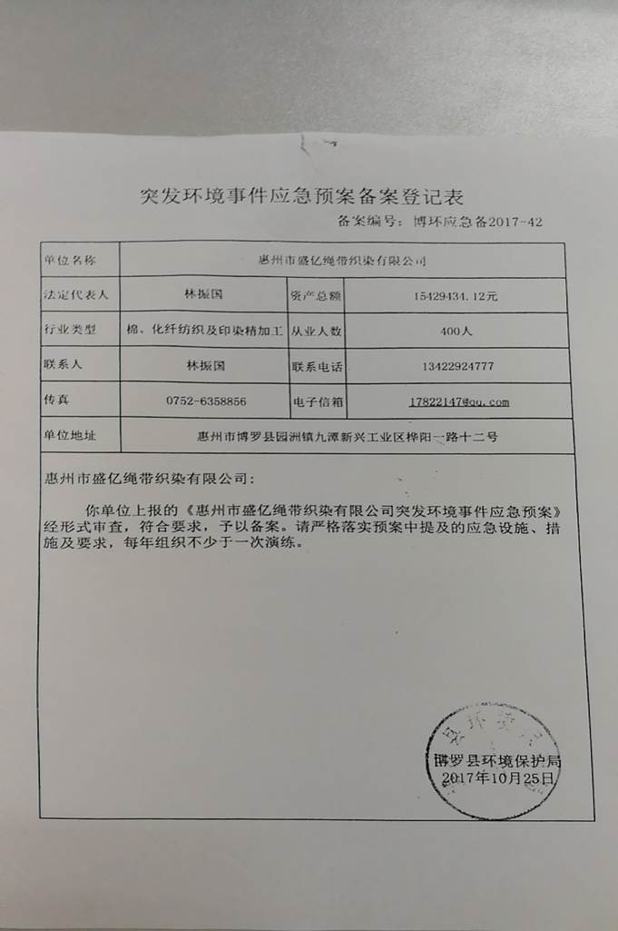 附件鏈接:《惠州市盛億繩帶織染有限公司突發(fā)環(huán)境事件應急預案備案登記表》
